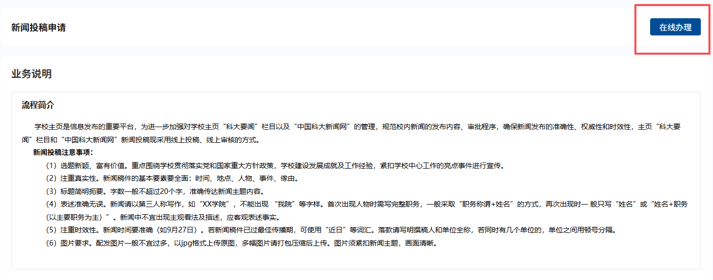 、点击【新闻投稿申请】,点击右上角【在线办理】