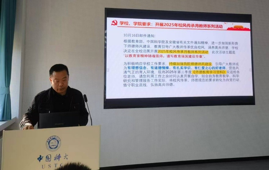 会议还安排了师德师风专题学习环节。支部副书记倪向贵围绕“以教育家精神铸魂强师,谱写教育强国建设华章”主题,向全体与会人员传达了学校关于开展2025年校风传承月教师系列活动的相关精神,号召全体教师深刻领会并自觉践行教育家精神,持续强化师德师风建设,努力争当“四有”好老师,为教育强国建设奠定坚实师资基础。