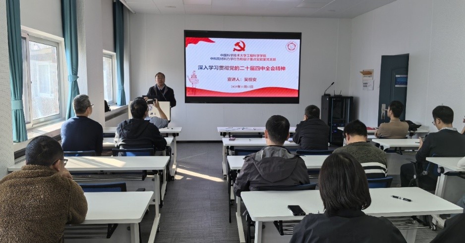11月12日,中国科学院材料力学行为和设计重点实验室党支部召开专题学习会,深入学习贯彻党的二十届四中全会精神。校党委委员、执行院长吴恒安讲党课,支部书记吴尚犬主持会议。