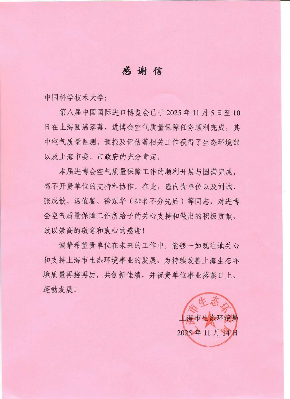 近日,中国科学技术大学收到来自上海市生态环境局的感谢信,对我校在第八届中国国际进口博览会期间(2025年11月5日-10日)提供的空气质量监测与评估支持表示高度认可与衷心感谢。信中特别提到我校工程科学学院刘诚教授、张成歆副教授带领研究团队在空气质量保障工作中做出的积极贡献,展现了中国科大在大气环境超光谱遥感领域的科技实力与社会担当。