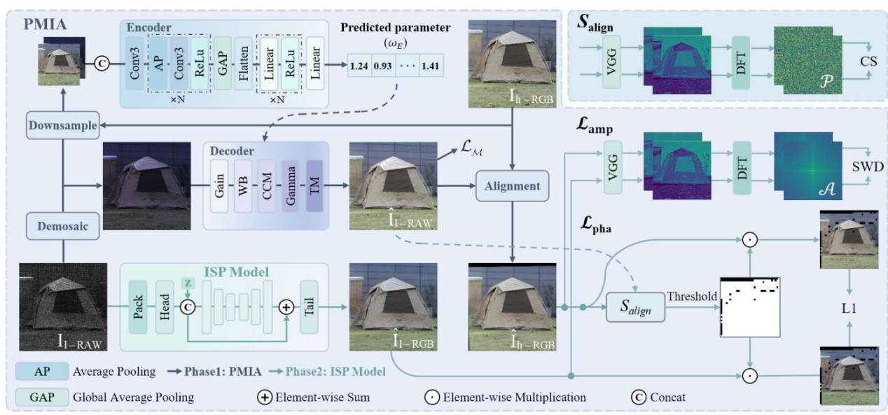研究团队通过设计分光采集系统,建立了首个低质RAW图像到高质RGB图像的大规模数据集(超28万对数据)。针对每个拍摄的场景,研究人员在不同退化水平下记录多张 RAW图像和一张对应的高画质RGB图像,其中高速摄相机帧率从100fps提高到10,000 fps,同时信号增益从0dB提升到40dB。与此同时,单反相机以最低ISO运行,曝光时间则自动调整以最大限度地提高RGB图像的质量。在此基础上,针对高速相机与单反相机传感器像元尺寸、分辨率等导致的固有像素不对齐,研究人员设计了错位感知ISP学习框架,解决像素不对齐下现有深度学习ISP模型易导致图像模糊的问题,实现图像高画质恢复。