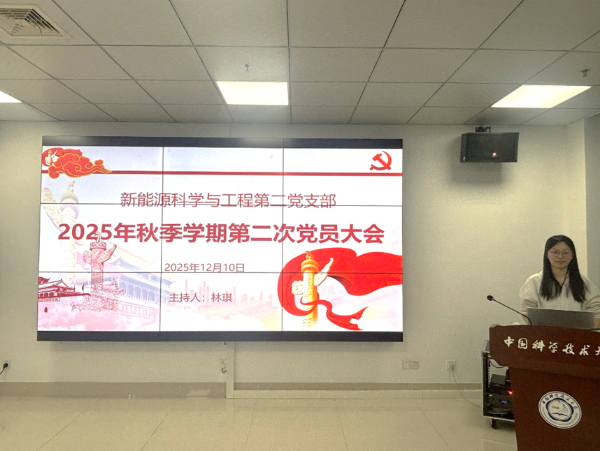 为深入学习贯彻党的二十届四中全会精神,系统把握“十五五”时期国家发展战略部署,进一步强化基层党组织政治功能和组织力,12月10日晚,新能源科学与工程研究生第二党支部召开2025年秋季学期第二次党员大会,聚焦“十五五”规划开展学习研讨。会议由党支部书记林琪主持。