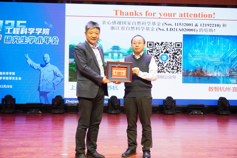 工程科学学院党委书记、副院长裴刚在总结讲话中勉励同学们坚守创新精神,积极展示成果,贡献智慧力量。吴恒安、裴刚共同为特邀报告嘉宾颁发纪念证书。