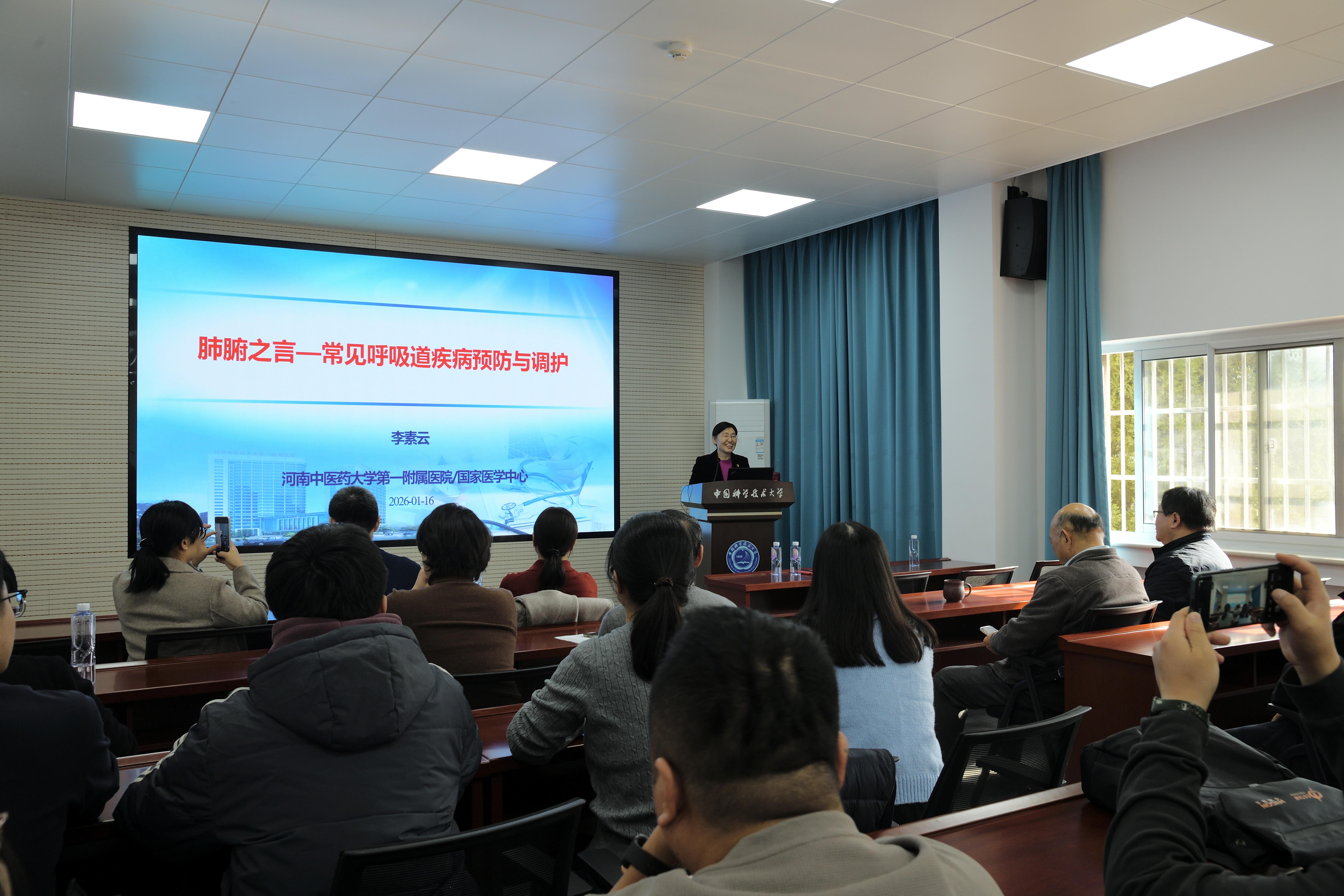 1月16日上午,应近代力学系邀请,国家区域中医(肺病)诊疗中心主任、河南省中医循证医学中心主任、河南中医药大学第一附属医院国家医学中心中医呼吸方向建设项目负责人李素云主任医师,在力学一楼237会议室作《肺腑之言——常见呼吸道疾病预防与调护》健康讲座。讲座由何陵辉教授主持,陆夕云院士,学院党委副书记、院工会主席牟玲等师生聆听了讲座。
