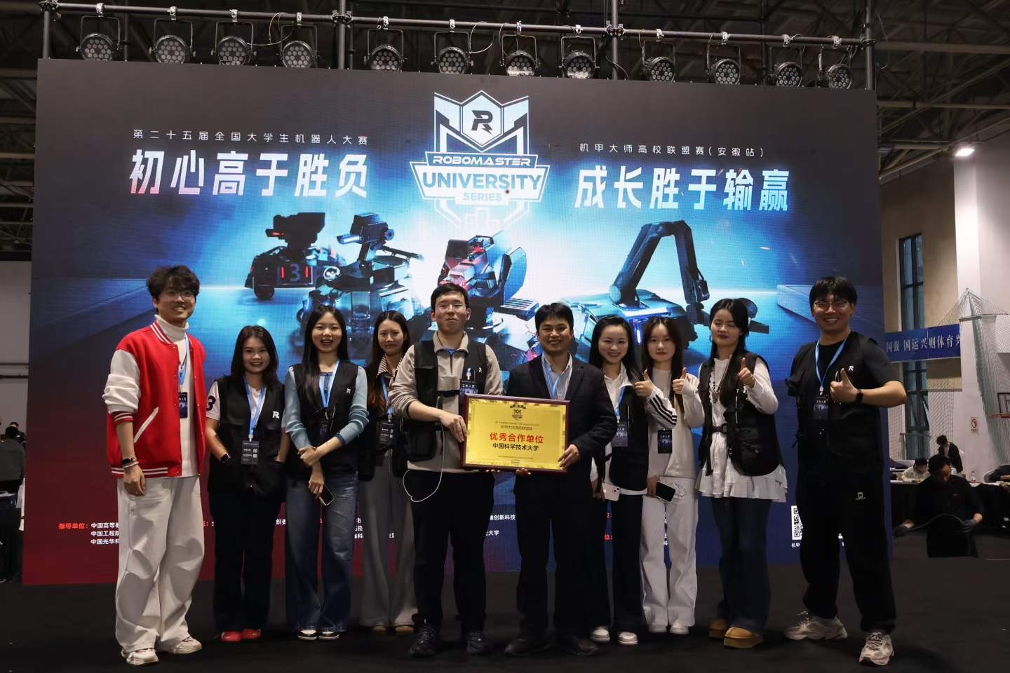 为表彰各方在科技创新和人才培养方面的贡献,开幕式上,全国大学生机器人大赛RoboMaster 组委会正式授予中国科学技术大学、合肥国先控股有限公司、合肥瑶海科技创新投资集团“优秀合作单位”称号。这一授牌不仅是对中国科大及工程科学学院在产教融合与科技创新教育上的高度认可,也寄托了各方深化协同育人、共筑创新生态的美好期许。