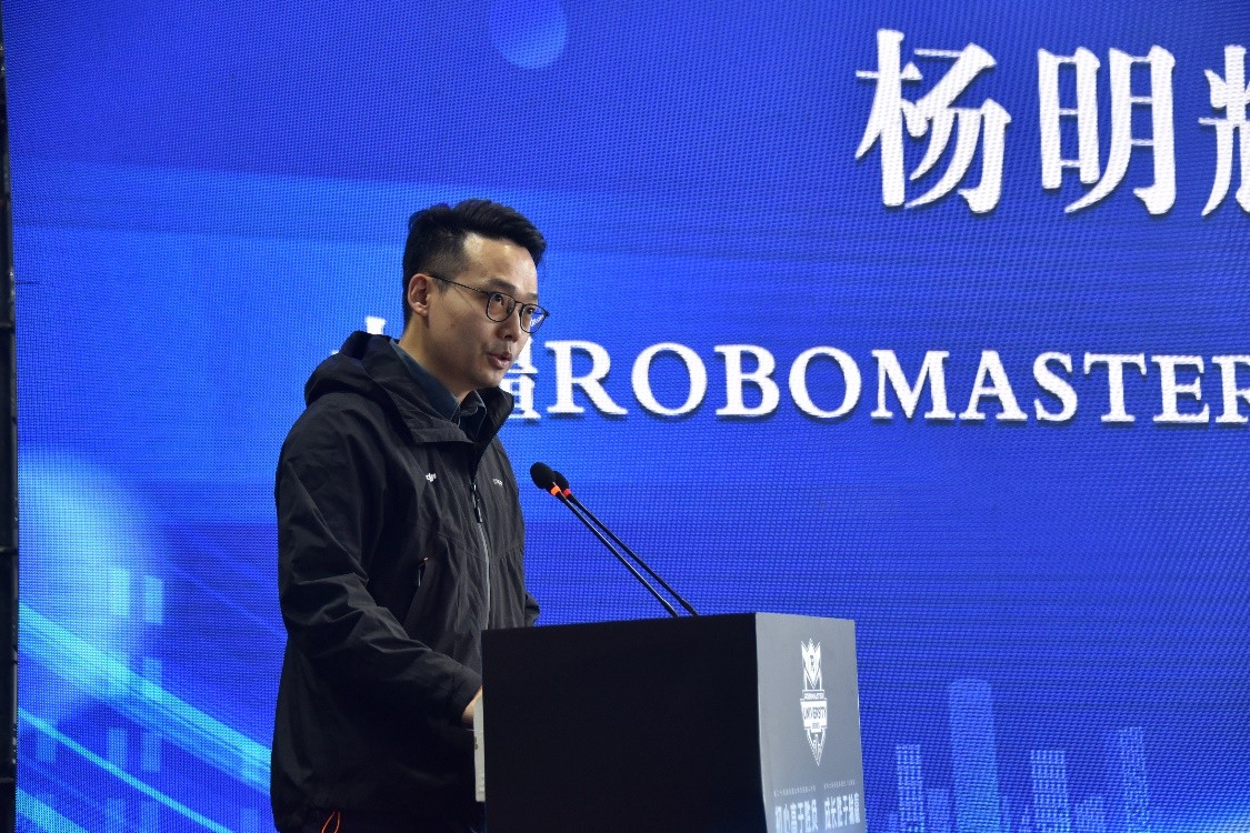 随后,大疆RoboMaster高级运营总监杨明辉在致辞中对中国科大为赛事顺利举办提供的大力支持表示衷心感谢。他指出,赛事始终秉承“为青春赋予荣耀,让思考拥有力量,服务全球青年工程师成为追求极致、有实干精神的梦想家”的理念。他期待通过将真实的产业需求转化为赛场命题,不仅能让同学们在实战中锤炼能力,更能借此契机促进地区高校之间的交流学习,为地方科技创新产业发展持续助力。