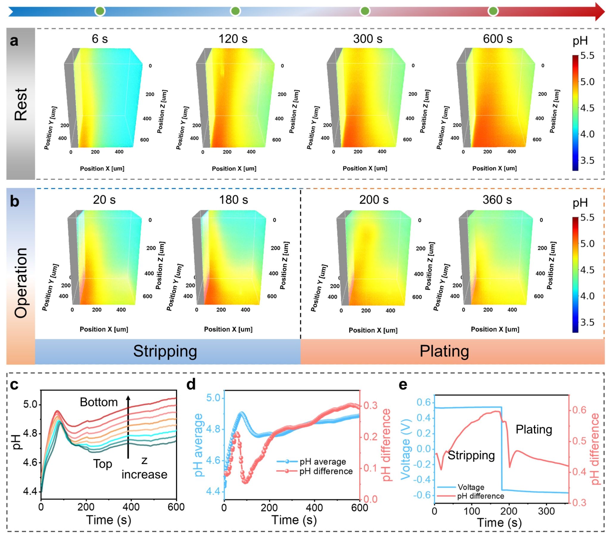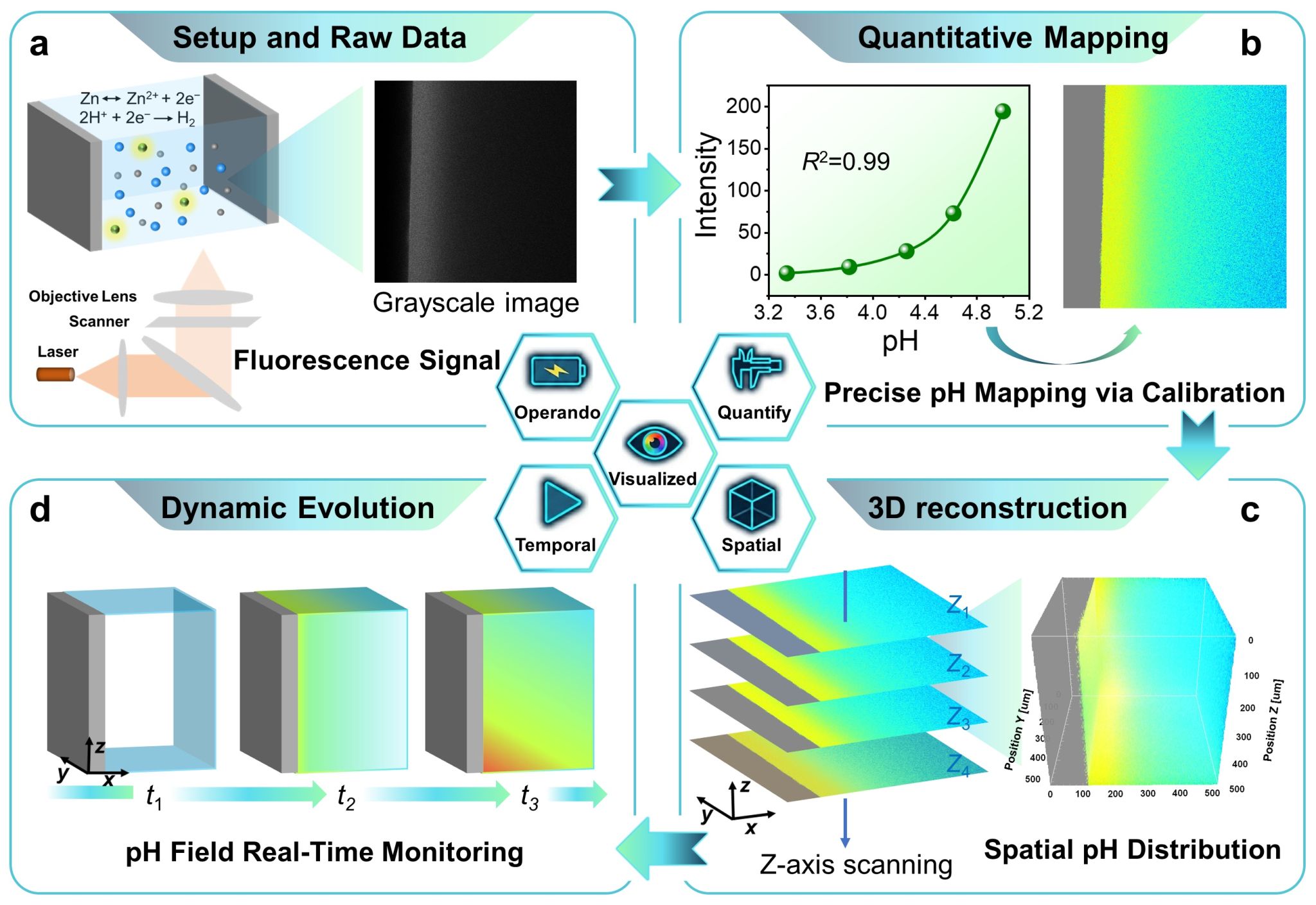 水系锌电池凭借其本征安全、低成本与环境友好等优势,在下一代大规模储能中表现出巨大潜力。然而,金属锌负极在水系电解液中的界面不稳定性严重阻碍了商业化进程,枝晶生长、析氢副反应、表面钝化及自腐蚀等问题相互耦合,导致电池循环寿命远低于理论预期。事实上,这些失效行为均受控于电极/电解液界面局部化学微环境,尤其是质子活性(即局部pH)的动态演化。局部酸化环境易诱发活性锌的化学腐蚀并加剧析氢反应,而局部碱化则促进碱式硫酸锌或氧化锌等绝缘副产物的生成,导致界面钝化和不均匀沉积。界面pH并非被动响应变量,而是直接决定锌负极反应选择性与演化方向的核心参数。因此,发展能够原位捕捉界面化学环境三维演化过程的表征方法,并深入理解其对电极稳定性的影响,对于揭示水系锌电池的失效机制以及提高电池性能具有重要意义。