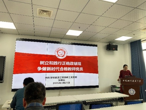 会上,党总支书记张晓愿以“树立和践行正确政绩观,争做新时代合格教师党员”为题作党课分享。她从“显绩”与“潜绩”的辩证关系出发,深入阐释了正确政绩观的内涵要义,并结合教师党员的本职工作,对“教师本职”的内涵进行了深入解读,引导大家把政绩观写在讲台上、刻在科研中、落在服务里、融入育人全过程,勉励全体党员争做有温度、有担当、有情怀的教师党员。随后,支部书记谈鹏代表支部委员会作2025年度工作汇报。他全面总结了过去一年支部在思想建设、组织建设、作风建设等方面的工作成效,查摆存在的问题与不足,提出今后努力方向,并带头开展批评与自我批评。全体党员依次进行批评与自我批评,认真填写了民主评议党员测评表。