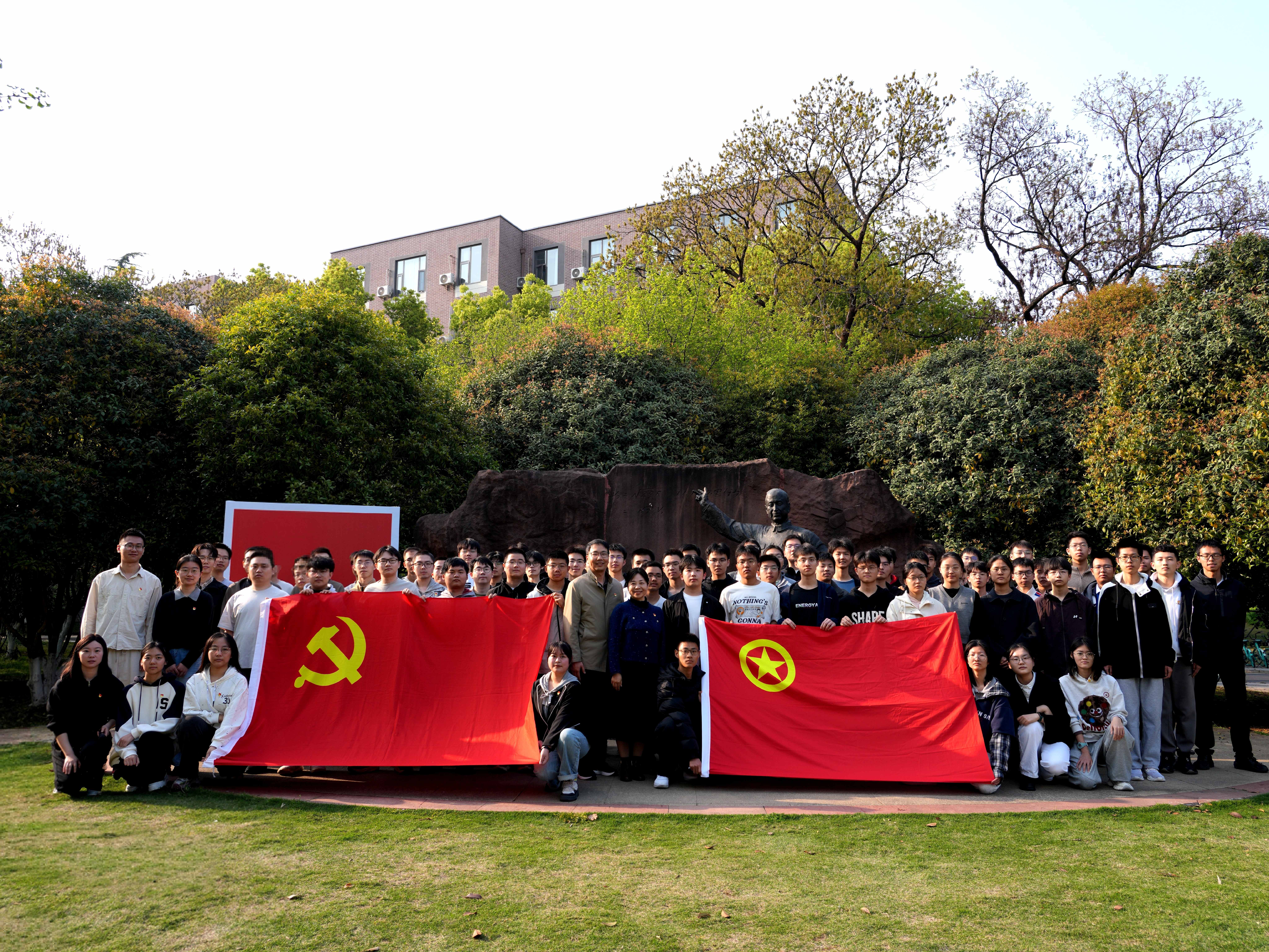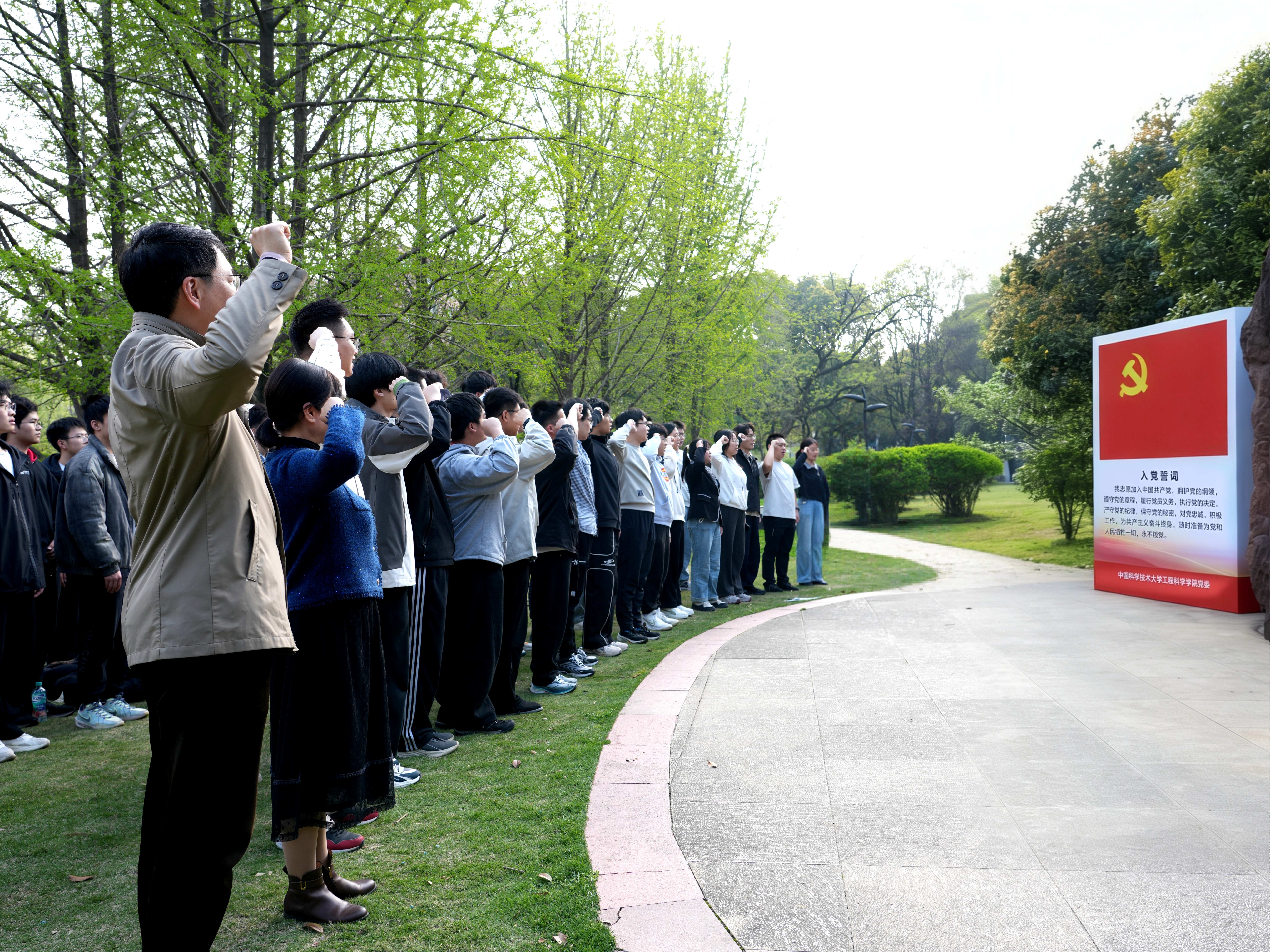 活动最后,本科生预备党员面向党旗庄严宣誓,老党员重温入党誓词,铮铮誓言回荡在雕像前,彰显出青年党员坚定入党初心、勇担时代使命,将传承钱学森精神与践行总书记嘱托融为一体的决心与信念。