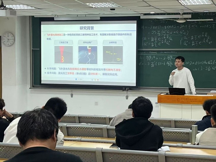 围绕核心研究方向,辛晨重点介绍飞秒激光微纳加工技术的优势,并分享团队两项突破性成果:一是揭示飞秒激光梯度活化水凝胶聚合新机制,将水凝胶孔隙调控至50纳米,为智能响应微器件设计奠定理论基础;二是提出空间光场调控高效加工新方法,使加工效率提升两个数量级以上,助力功能微器件批量制造。