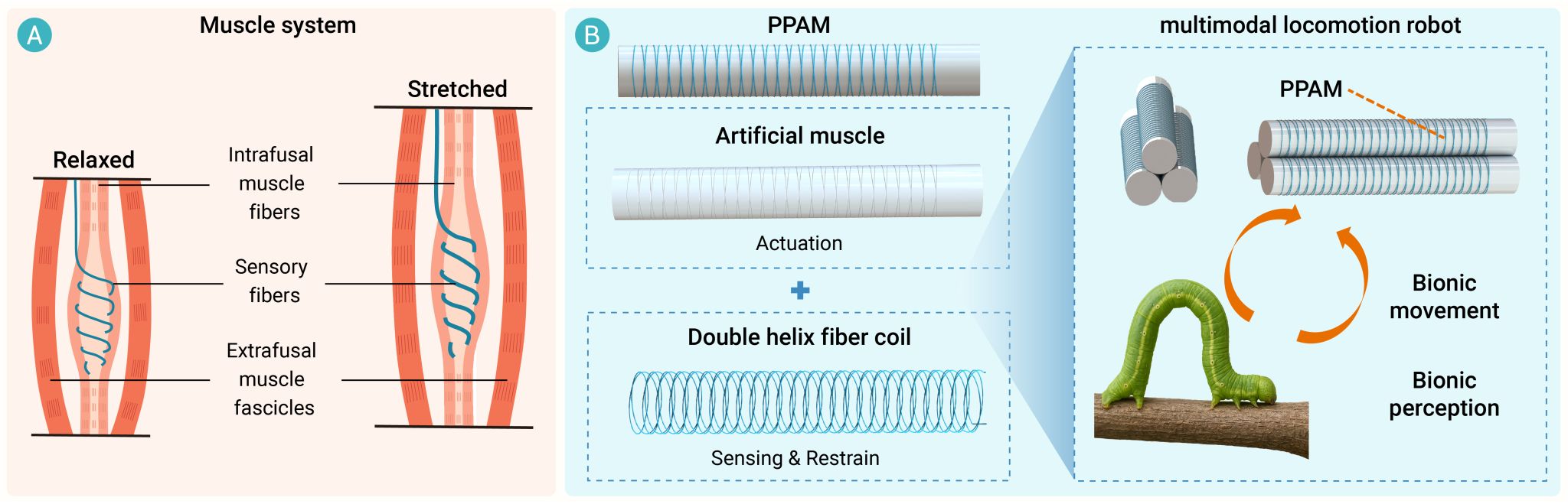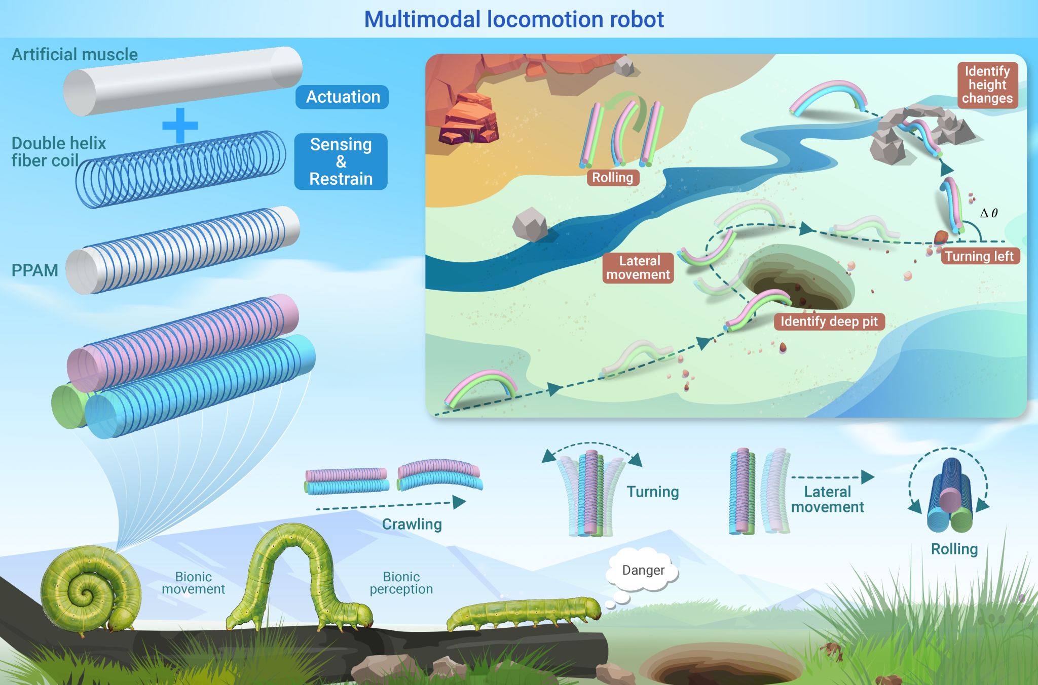 近日,中国科学技术大学工程科学学院、人形机器人研究院王洪波研究员团队从生物肌肉结构中获得灵感,成功研制出一种双螺旋纤维增强的自感知人工肌肉。基于三组人工肌肉的模块化组合,构建了多模态仿生移动机器人,实现了爬行、平动、转向、翻滚四种运动模式,以及多地形自适应移动与外界刺激感知决策能力。该研究为高度智能化探索作业机器人的发展提供了一种新的技术路径,同时也为基于人工肌肉构建感知型柔性操作器提供了新的设计思路,在软体机器人与智能驱动领域具有重要的研究意义和应用前景。成果以“A soft perceptive multimodal locomotion robot via double-helix fiber reinforced artificial muscles”为题发表在综合性国际期刊《创新》(The innovation)上。