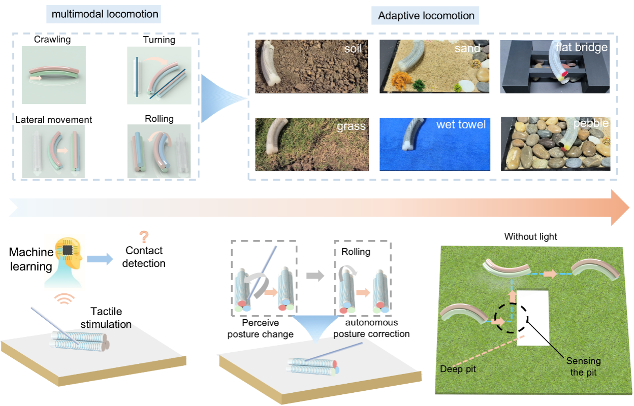 在自然界中,大多数爬行生物的视觉能力相对有限,主要依赖体表机械感受器感知环境中的物理接触和地形变化。受此启发,研究团队充分利用机器人感知-驱动一体化设计的优势,使机器人能够基于自身感知信息进行环境感知与运动决策(图3)。