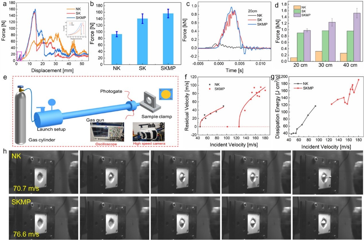 将剪切增稠液(STF)引入织物中以形成双相复合材料是一种提高柔性织物防护性能的潜在方法。研究团队通过静态/动态穿刺及高速弹道冲击实验,系统评估了SKMP织物的抗冲击性能。如图1所示,STF的引入显著提高了纤维间的摩擦耗能与应力传递能力,得益于STF的剪切增稠效应、纤维网络致密化等多尺度能量耗散机制的协同作用,SKMP在高速弹道冲击下展现出更为出色的极限穿透速度与比能量吸收能力,且能抵御多次连续冲击而不发生穿透。