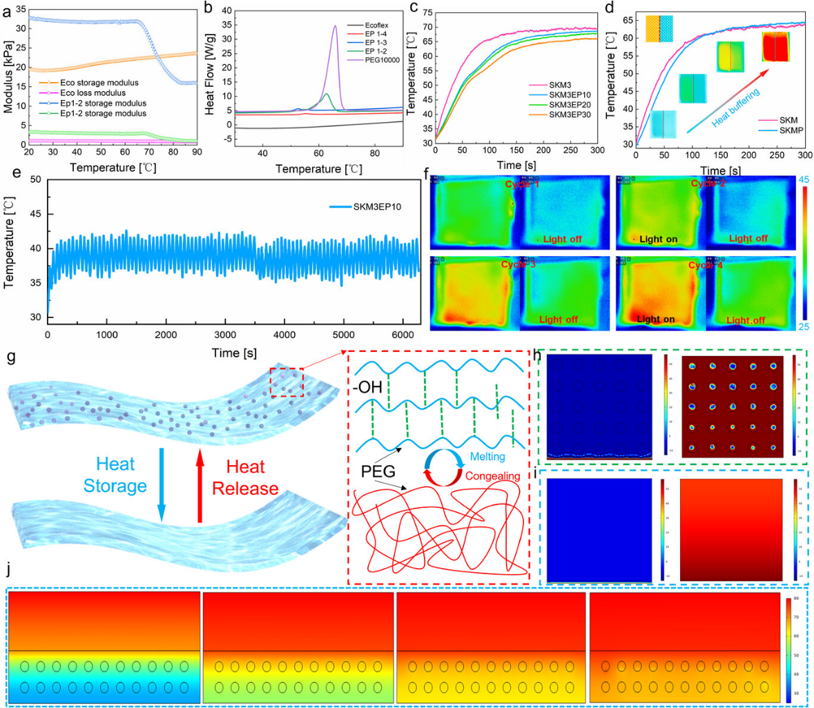 在力学性能显著提升的基础上,研究进一步赋予SKMP复合织物光热转换功能,并针对光热过程中易发的局部过热问题,设计了Janus相变热缓冲结构。当光热层吸收光能并产生热量时,热能传递至相变层并储存,从而减轻因温度剧烈波动可能造成的热损伤;当环境温度降低时,储存的热能再次释放以减缓热量散失。如图2所示,在相同光照条件下,SKMP复合织物的升温速率较不添加相变层的SKM织物显著减缓,平衡温度更低,并在多次循环中保持稳定的热响应特性。有限元仿真进一步表明,相变颗粒通过局部吸热延缓热量快速传递,有效抑制了温度的剧烈波动。