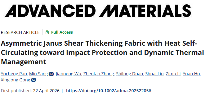 原文链接:Pan YC, Sang M*, Wu JP, Zhang ZT, Duan SL, Liu S, Li ZM, Hu Y, Gong XL*. Asymmetric Janus Shear Thickening Fabric with Heat Self-Circulating toward Impact Protection and Dynamic Thermal Management[J]. Advanced Materials, 2026, e22056. https://doi.org/10.1002/adma.202522056.
