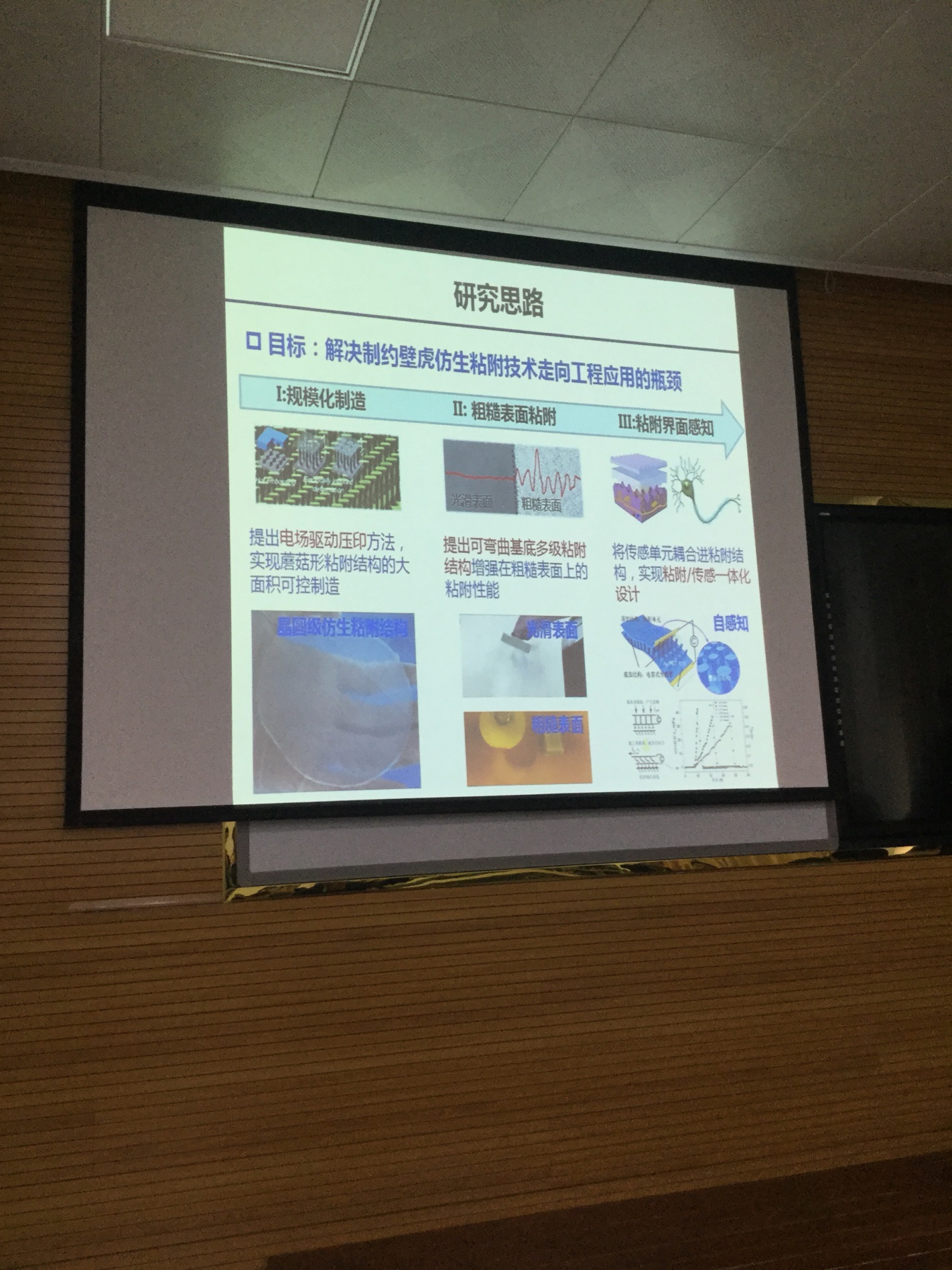 报告开始后,邵老师首先介绍了仿生粘附工程的研究背景,并提出了几点重大挑战,如:规模化制造技术的缺失制约着仿生粘附工程的实际应用;对光滑表面的研究制约了仿生粘附工程的研究范围;无力反馈机制等等。随后从规模化制造、粗糙表面粘附、粘附界面感知等三个方面阐述了自己的工作,并为仿生粘附工程的实际应用阐明了其极为广阔的前景。
